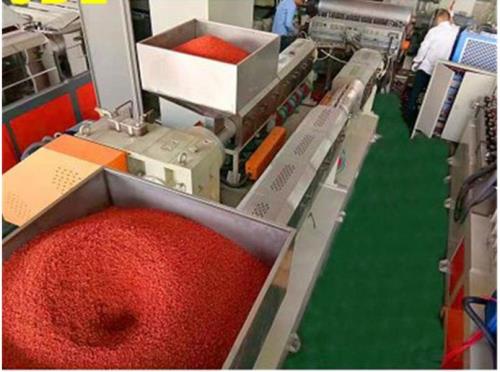 - 原材料準(zhǔn)備:TPV(熱塑性硫化橡膠)顆粒狀的原材料被加入到擠出機(jī)的料斗中。這些原材料是生產(chǎn)塑膠跑道的基礎(chǔ)物質(zhì),其性能和質(zhì)量對最終產(chǎn)品的品質(zhì)有著重要影響。